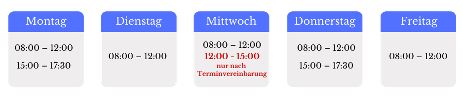 08:00 – 12:00 und 15:00 – 17:30